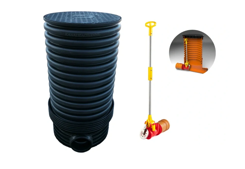 Poklop: Poklop není uchycen a je zasazen do prodloužení bez těsnění, což umožňuje snadné sundání a přístup k revizním prostorům. Proto tento set doporučujeme spíše na soukromé pozemky (Lze upevnit vrutem 2x otvor)