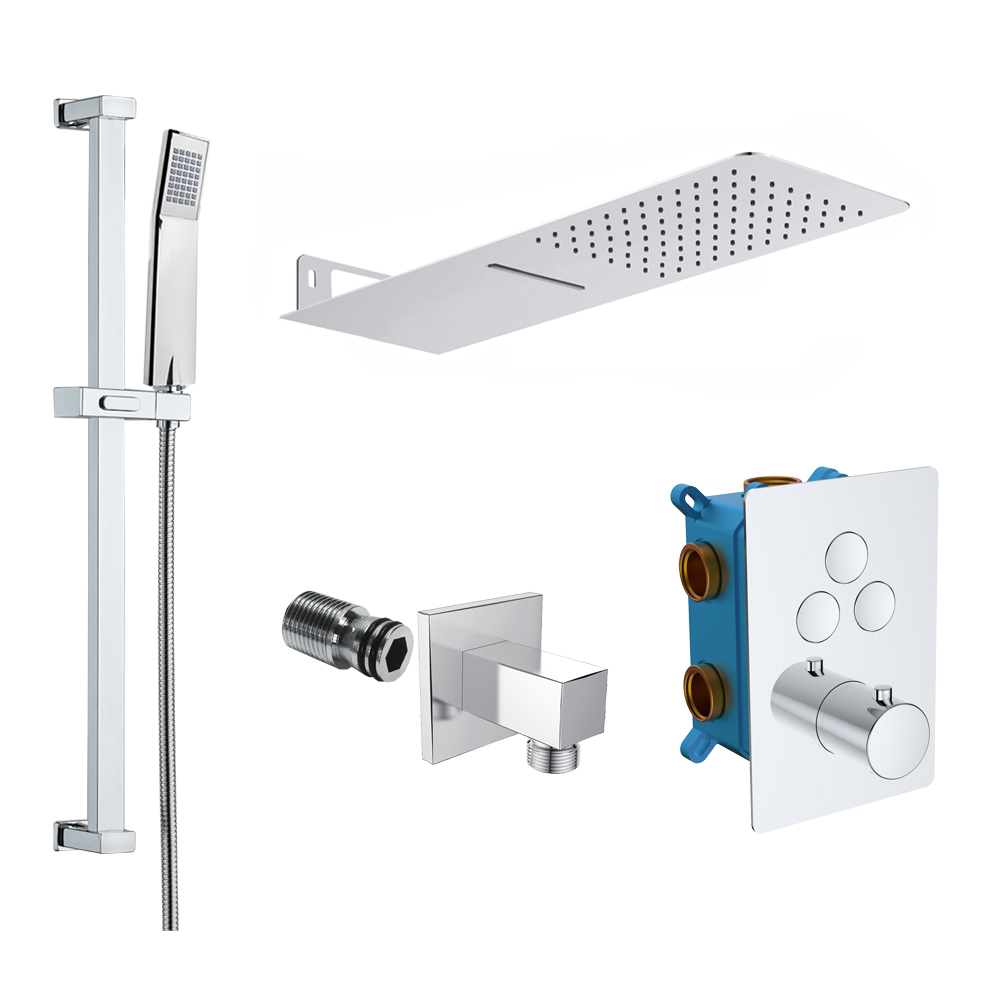 Sprchová sada s termostatickou podomítkovou tlačítkovou baterií - 3-cestná - hranatý kryt