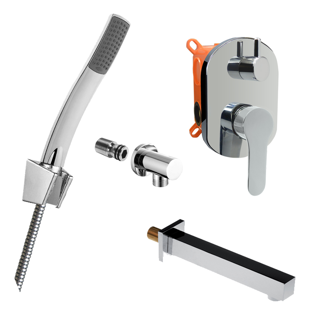 Dvoucestná podomítková baterie s keramickým přepínačem, Mbox, oválný kryt, vývod, nerezová dvouzámková hadice 150 cm, držák sprchy, jednopolohová ruční sprcha, vanové napouštěcí ramínko.